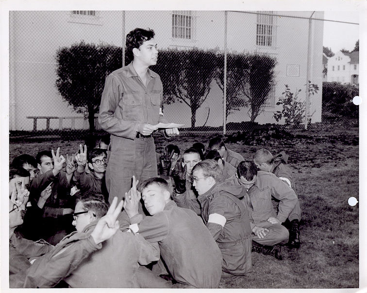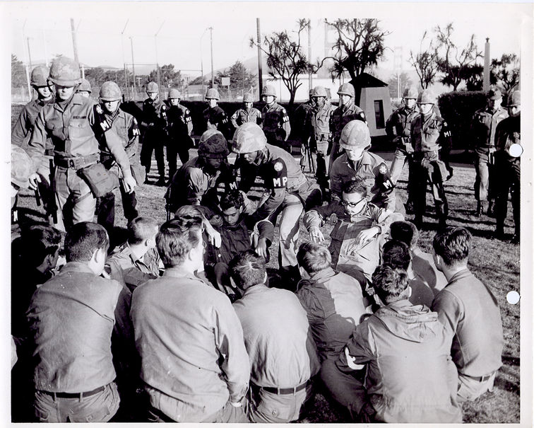 The minimum-security stockade at Ft. Scott, the Army base once located on the grounds of San Francisco’s old Presidio, was built before the First World War to house a maximum of 56 men. At the time of the Vietnam War, the small jail cell was bursting with 115 imprisoned soldiers there in 1968. Most of those being held there were charged with offenses related to going AWOL, desertion, or war resistance, with petty thieves or drug users intermixed. Besides overcrowding, conditions at the stockade were quite terrible. Relatively large, open cells had been divided into tiny windowless quarters—many smaller than the Army’s minimum requirement of 6’ x 8’ –and painted black. The minimum-security prisoners were forced to labor under the watch of shotgun-wielding guards (also armed with urine-loaded water pistols) who employed the tactics of random beatings, finger and testes twisting, and pointing their weapons at prisoners and threatening death. Sixty suicide attempts were reported in the Ft. Scott stockades, at the time all denied by the Army.