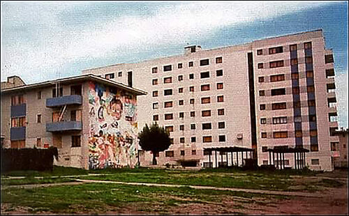 * PING YUEN ( "Tranquil Garden") by John Bolles and J. Francis Ward, 1- to 4-bedroom, 1952. A manager of this complex refused a routine request to visit lest residents' privacy be invaded; she said there were no unoccupied units that could be shown. The six-story midrise complex facing Pacific Street in Chinatown has tiered, pagodalike external balcony corridors, a style that architectural historian Gwendolyn Wright calls "Chinese regionalism superimposed over a functionalist design." Its 234 street-facing units, built at 89 units / acre—the highest density of any Bay Area family housing project—accommodate Chinese families and the elderly. Fenced rear court play space for youngsters appears cramped but protected. The project's reputation for undisturbed tranquility contradicts accepted wisdom that highrise public housing doesn't work for families.