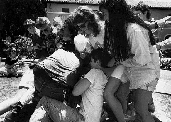 Operation Rescue unites groups of people who sincerely believe all the other groups are going to burn in hell, devout Roman Catholics, Bible-believing Baptists and Spirit-filled Pentecostals, in rather authoritarian public displays of passive aggression: mass sing-, lie-, and kneel-ins to shut down medical facilities where abortion is offered. With less media presence OR members mount more violent attacks against clinics, their clients and escorts (calling the latter "death squads" is one of their more absurd attempts to ape activist-speak). The clinic attackers I've spoken with are quick to point out that there has never been an OR member convicted of actual clinic arson or bombing, but membership is fluid, and their training literature advises outright deception (key OR leaders in the Bay Area disavow all knowledge of the organization!) as well as vagueness about OR activities beyond the orchestrated media events.