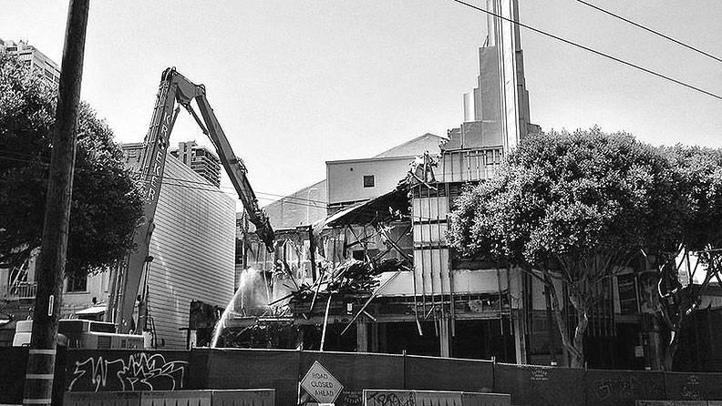 Walk by the corner where Powell Street meets Columbus Avenue, across from Washington Square, and you will see it is a construction site again. This noisy activity is on its way to becoming a major Mexican restaurant with several floors of pricey condominiums above and underground parking below—the outcome of a long battle over the fate of the landmark theater building which was demolished in 2013, graffiti and all.