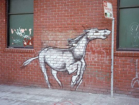 One of the 1990s' generation of artists to appear on the walls of San Francisco was Ruby Rose Neri, aka "Reminisce." Her trademark image was an amazing profusion of horses, hundreds of wild horses suddenly rearing up, riderless, around the City.