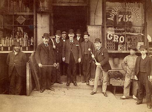 Chinatown Squad of the SF Police Dept. posing with sledgehammers and axes in frontof August Pistolesi's grocery store at 752 Washington Street, 1895.