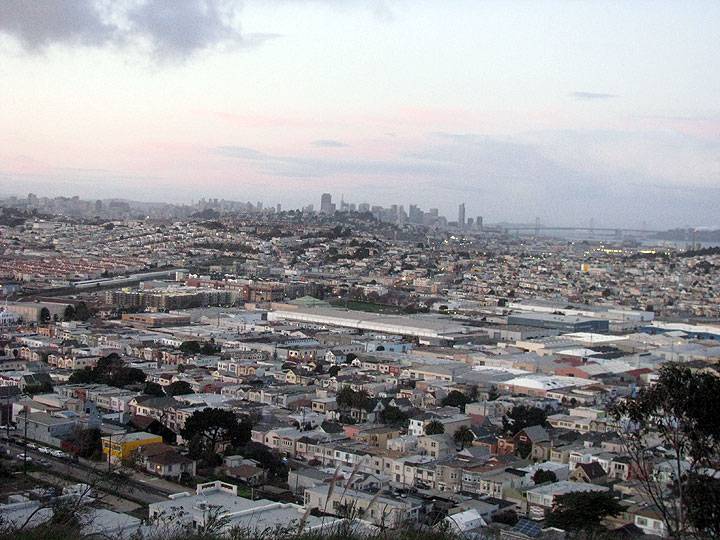 This photo from Bayview Hill in January 2010 shows the southeastern neighborhoods of San Francisco stretching northward towards downtown.
