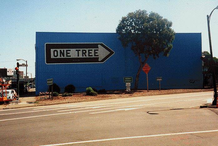 Another Rigo piece, One Tree (opposite the 10th Street on-ramp to southbound Highway 101) points to a single tree planted between a corrugated tin-wall and the freeway on-ramp. The question, of course: Why just one tree? By the time the traffic-light turns green and the queue of commuters joins thousands of familiar automobiles on 101 South, most motorists have made the connection.