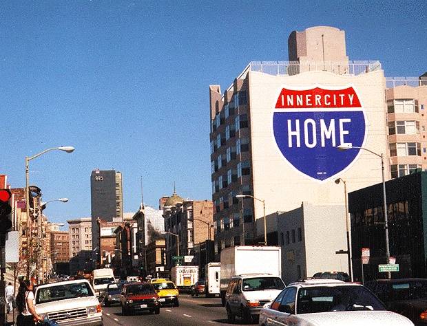 The importance of art being accessible to its audience is evident in the work of Rigo, SF's notorious "road-sign" artist. Rigo is best-known for his exploitation of the public's trust of municipal symbols. His piece Innercity Home, shown at right, parodies signs for Interstate 80, the freeway from which the mural is visible. The insertion of a term associated with domestic individuation -- "HOME" -- inside a symbol passed by tens of thousands SF commuters each day faces motorists returning from day-jobs in Silicon Valley to single--bedroom apartments in San Francisco.