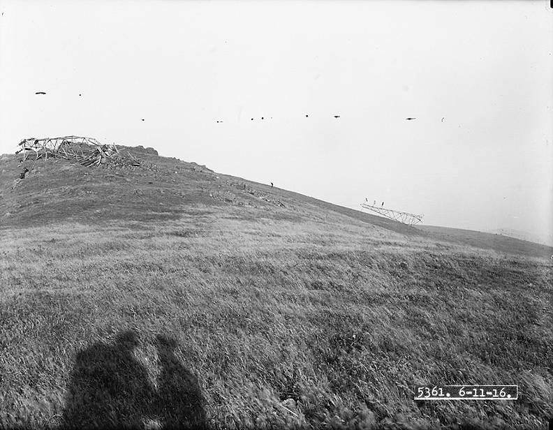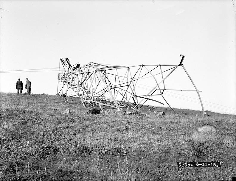 Fallen power towers for the Sierra and San Francisco power company, supplier to United Railroads, blown up during the night of June 10-11, 1916.