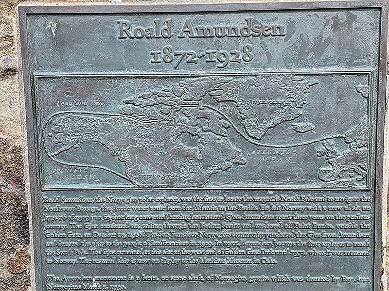 The Amundsen monument is a bauta, or stone shaft, or Norwegian granite which was donated by Bay Area Norwegians, March 1, 1930.
