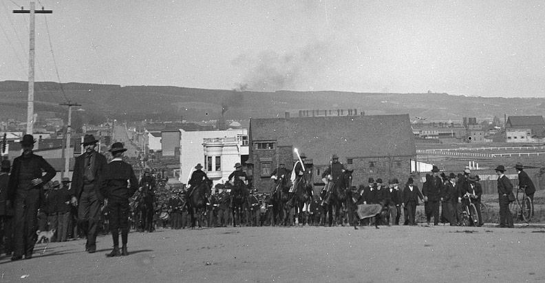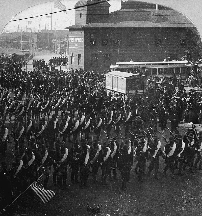 Reinforcements march through San Francisco on their way to reinforce Admiral Dewey's seizure of Manila against Philippine revolutionaries.