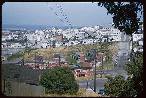 May 17, 1954, view of Public Housing projects at 19th and DeHaro. Later to be cleared for public school, and slopes behind have been filled with condominiums, after a lengthy public effort to maintain the open space.