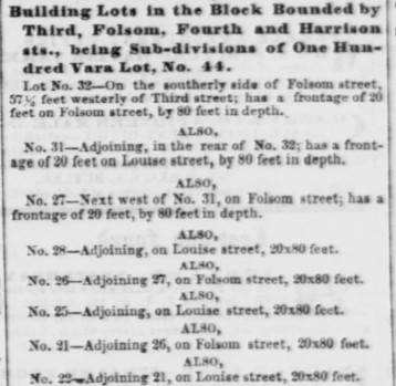 Louise Street is first listed in the Daily Alta concerning the subdivision of the 100 Vara lot No. 44 (betw. Third and Fourth Folsom and Harrison) in 1857.