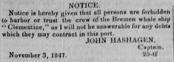 A Clementine Street is first listed as a street in the Daily Alta in August 1850, and an article about a Bremen whaling ship Clementine—with an untrustworthy crew—can be found in the Californian at the early date of November 1847.