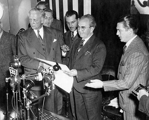Tom Mooney receiving his pardon from Culbert Olson, Jan. 7, 1939.