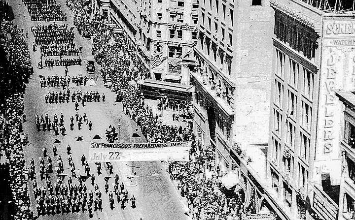 The Preparedness Day parade on July 22, 1916, at apx. Market and 3rd Streets.