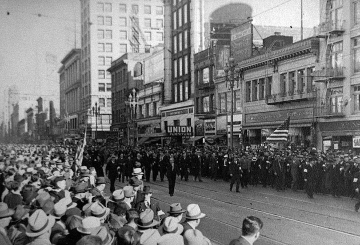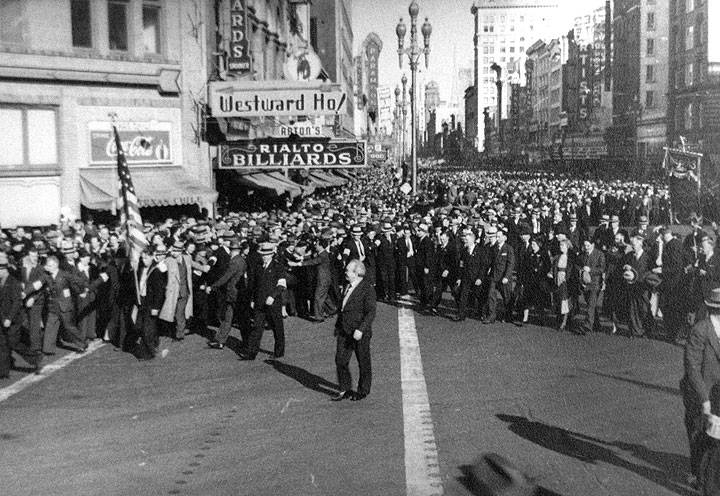 If the working class of San Francisco was down, it was not out. When the Great Depression and the beginning of the New Deal began to weaken the power of capital, organized labor returned to the city with a vengeance. The longshoremen were again first out of the gate, pushing for higher wages and an end to the ‘shape-up’ system of daily hires. A conference of all West Coast dockers in San Francisco in early 1934 was followed by a break with the company union and then with the leadership of the East Coast-based International Longshoremen’s Union. A strike was called, and tensions ran high. The police killing of two strikers triggered a huge funeral march up Market Street – vastly exceeding the notorious Preparedness Day march in size and enthusiasm – and then to a General Strike of all the city’s unions. The city was shut down for three days (Selvin, 1996).