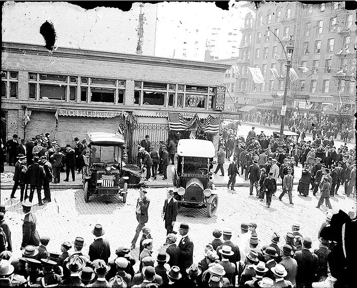 An hour or so after the bloody Preparedness Day bombing, July 22, 1916, at the intersection of Steuart and Market in San Francisco.