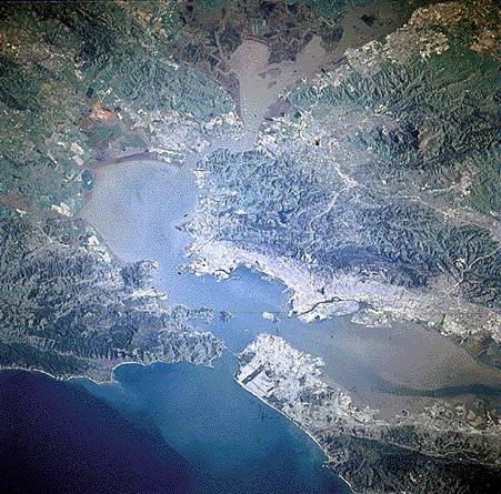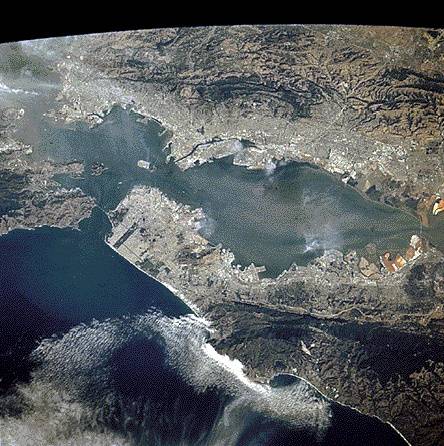 San Francisco from space with fog encroaching. The city is at lower left; San Jose is in the right-center.