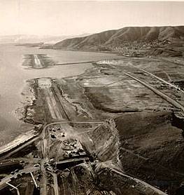 Aerial view southward along the Highway 101 construction corridor in 1955, Brisbane Lagoon still being filled by San Francisco's garbage.
