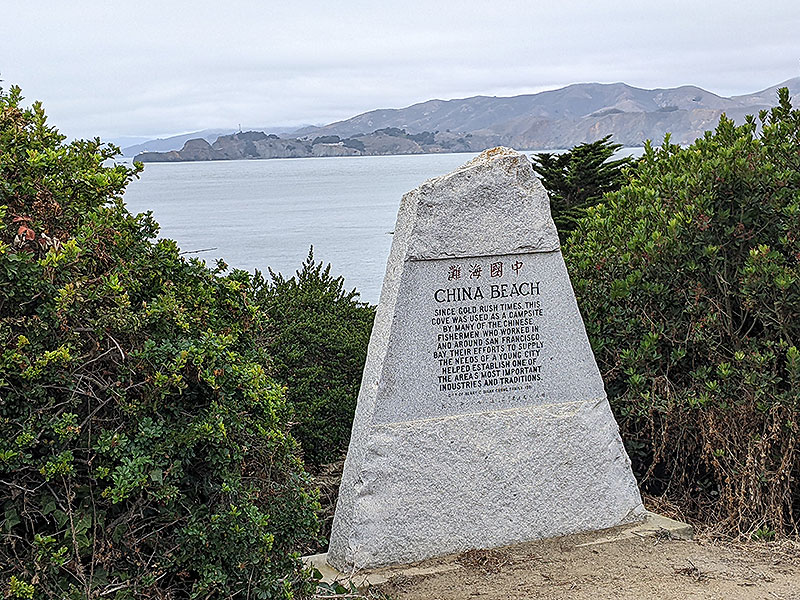 Monument to Chinese workers at China Beach near Seacliff reads: CHINA BEACH - Since Gold Rush times, this cove was used as a campsite by many of the Chinese fishermen who worked in and around San Francisco Bay. Their efforts to supply the needs of a young city helped establish one of the area's most important industries and traditions.