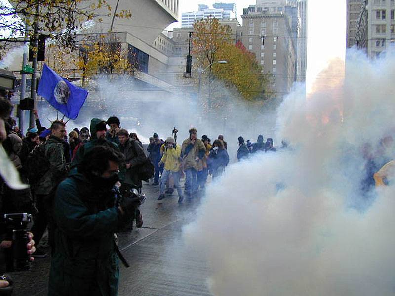Despite heavy tear gas usage, demonstrators held their lines and successfully blockaded the first day of the World Trade Organization ministerial meetings.