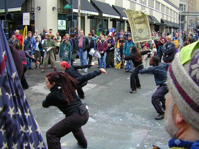 The San Francisco-based group "Art and Revolution" seen here dancing in the streets during the WTO protests.