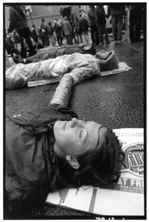 Art and Revolution standing amidst large seated crowd in downtown Seattle intersection, November 30, 1999.
