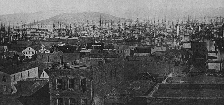 During the height of the gold excitement, there were at least five hundred ships stranded in the harbor, some without even a watchman on board, and none with a crew sufficiently large to work her. Many of these vessels never sailed again. Some rotted away and sank at their moorings. (Herbert Asbury in "The Barbary Coast")