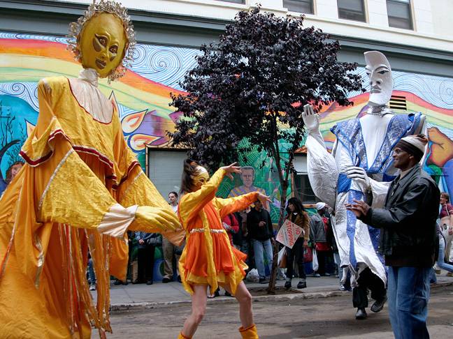 Positively Sixth Street, 2005. A fair-goer dances with the Sun and Moon Ensemble that graced the fair several years.