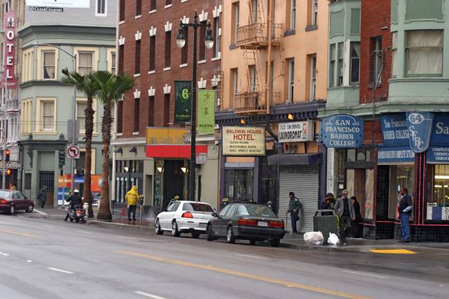 The sun had disappeared behind a shroud of fog that scudded by in great swirling drifts, like the sails of a phantom armada. What had been a warm day was quickly becoming cold. Sixth Street between Market and Howard was all noise and hubbub, but beyond Howard Street the chaos subsided and the sidewalks were empty. As I walked past the rotting hulk of the Hugo Hotel, I overtook a lone pedestrian, a man with a cane, burdened by a backpack and a duffel bag. Moments later, from behind me he called, “Hello? Hello?”