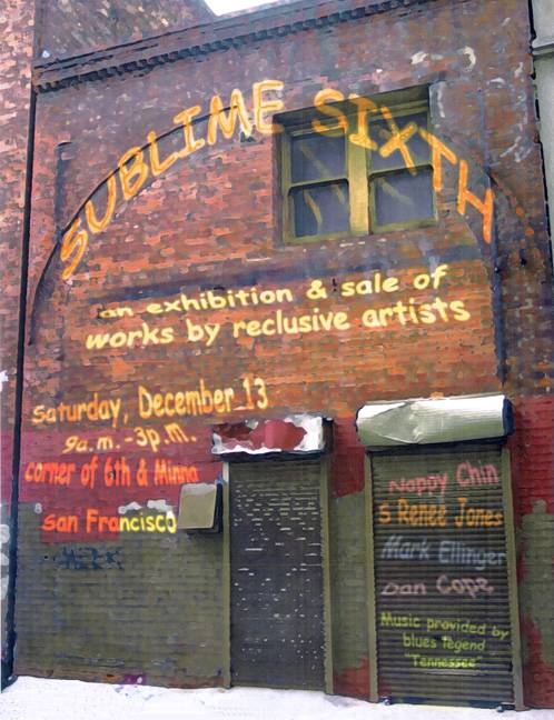 "Sublime Sixth" exhibit, December 2003. An unidentified visitor and Joann Babiak inside the Community Justice Office at Sixth and Minna.