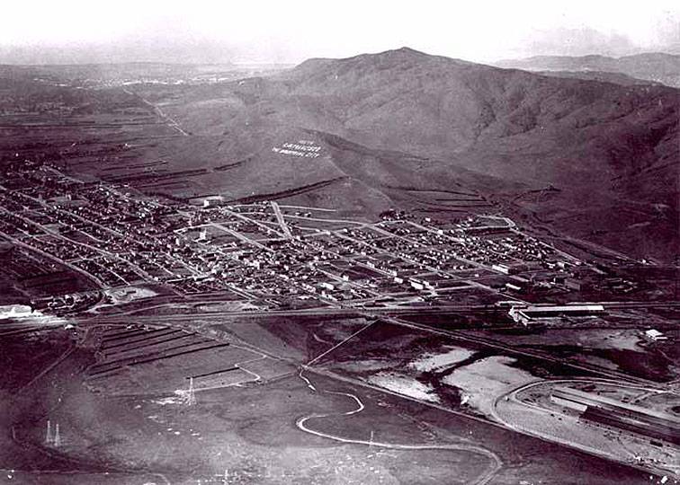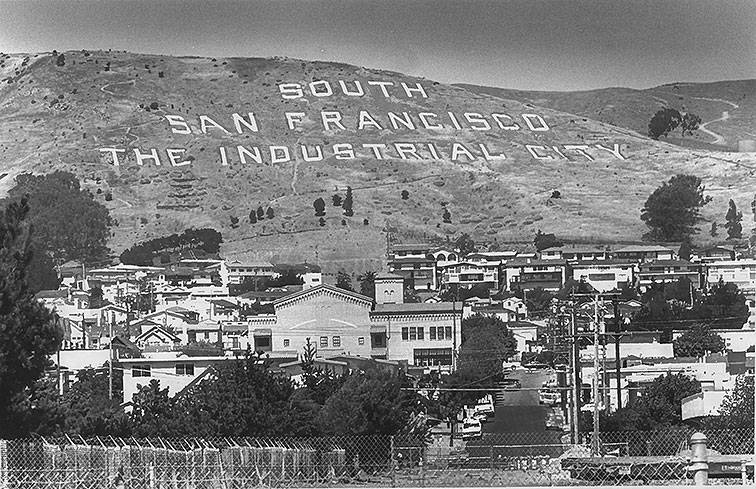 Driving north on Highway 101 along the San Francisco Bay, it’s difficult to miss the enormous message pasted onto the south side of the San Bruno Mountains: white concrete block letters that proclaim in all caps, “SOUTH SAN FRANCISCO THE INDUSTRIAL CITY.” For many commuters and passersby, a glimpse of this sign is the deepest connection they’ll ever have with South San Francisco, and perhaps they won’t even realize that it’s a separate municipality from San Francisco itself—a confusion that has annoyed members of the South San Francisco community from its early years, and which this very sign was built to rectify. The sheer size of the sign (each letter ranges from 48 to 65 feet tall) conveys a heft and sense of long-lastingness (Continuation Sheet: South San Francisco Hillside Sign, Section 7 pdf). So perhaps it is not difficult to imagine a Ford automobile dealer back in the 1930s named Fred Lautze, whose business had been decimated by the Great Depression, towing a car along Grand Avenue to make some money and looking up at the same sign (“Life in the 1930’s” 1). One can imagine how ironic this brash sign might have felt to this man who had lost most of his work; while the city’s many factories survived the Depression, not every individual thrived through this period. The hillside sign’s long history provides a lens through which we can consider how South San Francisco has changed over time and how the proud presentation of industry as a city’s face has a more complicated push and pull of human interests behind it.