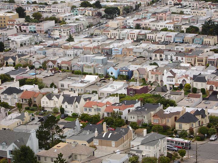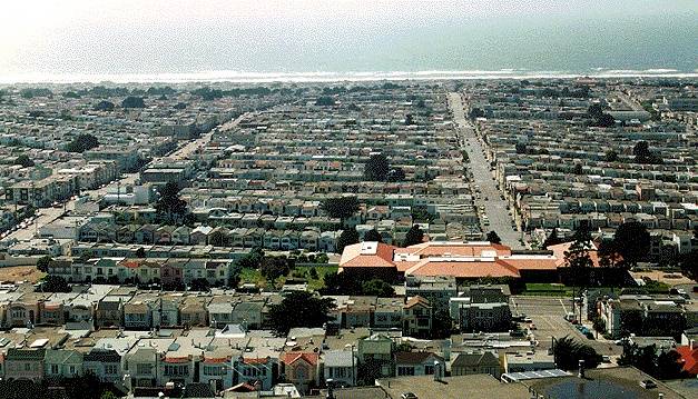 The sand dunes that covered the Sunset District were finally covered over during the post-WWII construction boom. The mass produced homes and their cement front yards have since become the object of considerable derision among residents of the older parts of San Francisco, but remain a relative bargain for working and middle-class individual housing. On the infrequent clear days, when the fog lifts, a spectacular view of the Pacific Ocean is one of the secret benefits of living in the Sunset.
