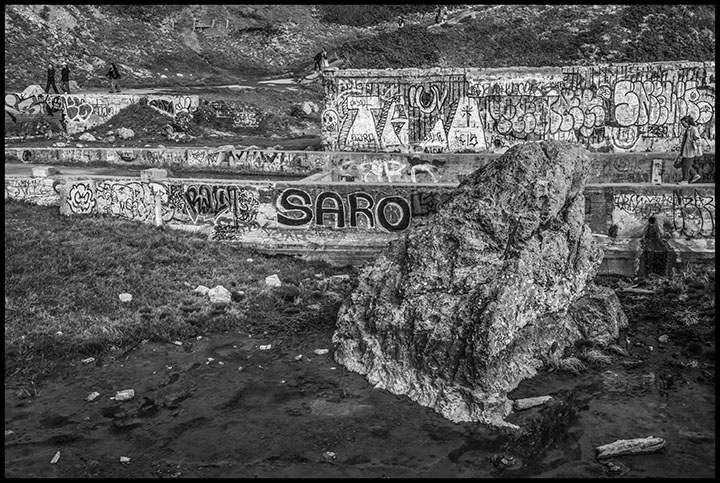 Today visitors easily walk down to the ruins of the baths. Between shrubs that threaten to obscure the walls, local graffiti artists have painted much of what remains. Their contribution makes the area come alive. On one ancient, desiccated ceiling truss someone has painted “Free Gaza.” People care in their way, enough to use dead detritus as their easel, giving justice a voice in the present.