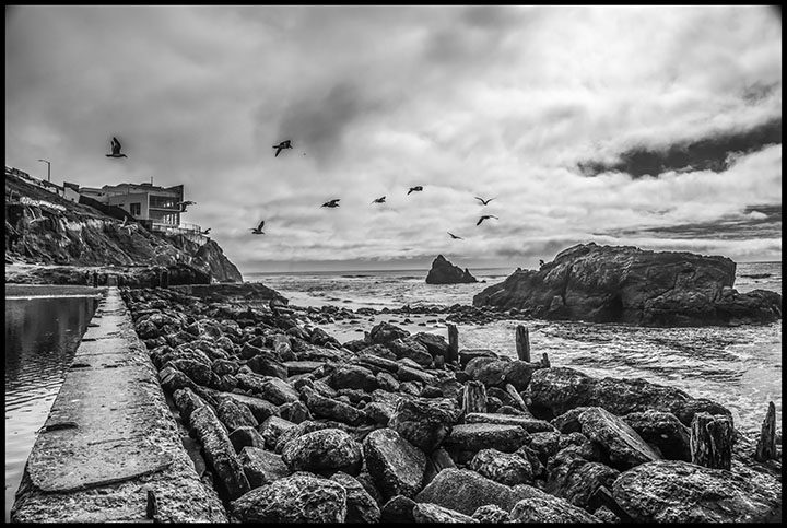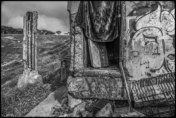 But as I walked east along the bluffs, I saw another piece of San Francisco’s reality today. People were living in small encampments, hidden away under trees clinging to the cliffs. A red umbrella shaded a pile of visqueen, presumably from a tent to protect whoever sleeps there from the wet fog that blankets the west edge of the city on so many nights.