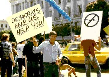As we got more organized, Garry McGregor was elected Chair. He invented our most successful type of action: the "Blitz Picket Line." In the case of cab drivers, what we had were a few people willing to walk a picket line, but the majority would be reluctant to be that visible, they would, on the other hand, be willing to "go somewhere else." So Garry had an inspiration: a few of us would make arrangements to call each other up at a specific time, say 4:00 PM tomorrow. At that time we would decide to meet at a specific hotel in twenty minutes with all our picket signs. In twenty minutes, we would descend on that spot, and go up and down the cab line, asking drivers "to serve another area of the city for the next two hours." and--PRESTO!--all the cab drivers would leave because there was always some place else they could be and make money. They could, by doing what came naturally (and not sticking their necks out), make a political statement. It was the perfect kind of protest for cab drivers: they could feel good about honoring the picket line and still not put their jobs in jeopardy. Our little group would walk a picket line in front of the hotel, with signs that said things like "DEMOCRATS: DON'T TAKE OUR JOBS! !