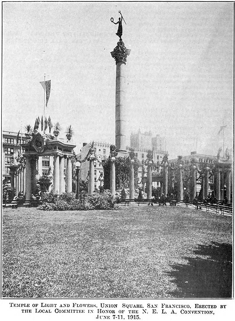 This Temple was erected [in Union Square] by the local committee as a welcome to the National Electric Light Association. It consists of a rectangular Italian Colonnade of the Ionic Order, held together by pavilions in the corners. Hundreds of hydrangea in full bloom, ranging in color from cream to deep pink, banked around the base of the Dewey monument and in the large urns in the pavilions, as well as the small urns surmounting the columns, form the basis of the floral decorations. This is supplemented by masses of drooping eucalyptus around the subbase of the shaft and on the caps of the pavilions. These green banks are studded with Novagem jewels, the same as used on the Tower of Jewels at the Exposition.