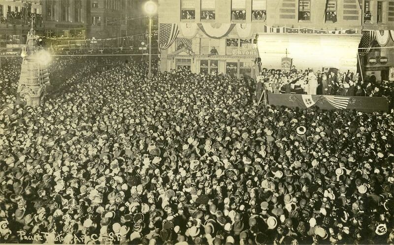 The United Railroads company graciously complied with the mayor’s request to divert streetcar lines during the event. Not that they would have been able to get anything through the intersection of 3rd and Market streets when the evening came.
