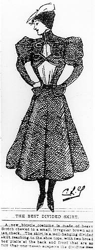 In 1892 at the posh Palace Hotel in downtown San Francisco, Anna Janess Miller, editor and owner of her own magazine, Janess Miller Monthly, hosted a fashion show of her bifurcated skirts. Through her periodical, she sold patterns and designs of the divided skirt, all the rage with the women's bicycle set. Curiously, in 1851, another Miller, Elizabeth Smith Miller, cousin to Elizabeth Cady Stanton, originated the first woman's pants creation, the bloomer costume. The women's magazine Lily advocated the bloomer as a response to women's concern for the safety of wearing long skirts and the unsanitary conditions of long trailing skirts in contact with mud and dirt of unpaved streets. The bicycle craze that hit San Francisco around 1895 provoked a need for a safe tangle-free costume for the new woman who wanted her own wheels, another sign of a liberated, emancipated woman who wanted to move in her own time, rhythm, and place.