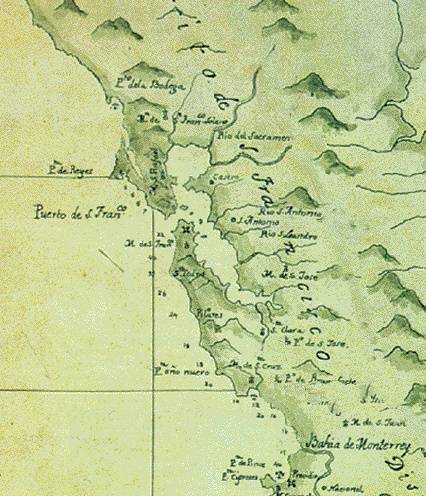 Early Spanish map of the Bay Area from the Presidio in Monterrey (sic) to Bodega Bay in the north.