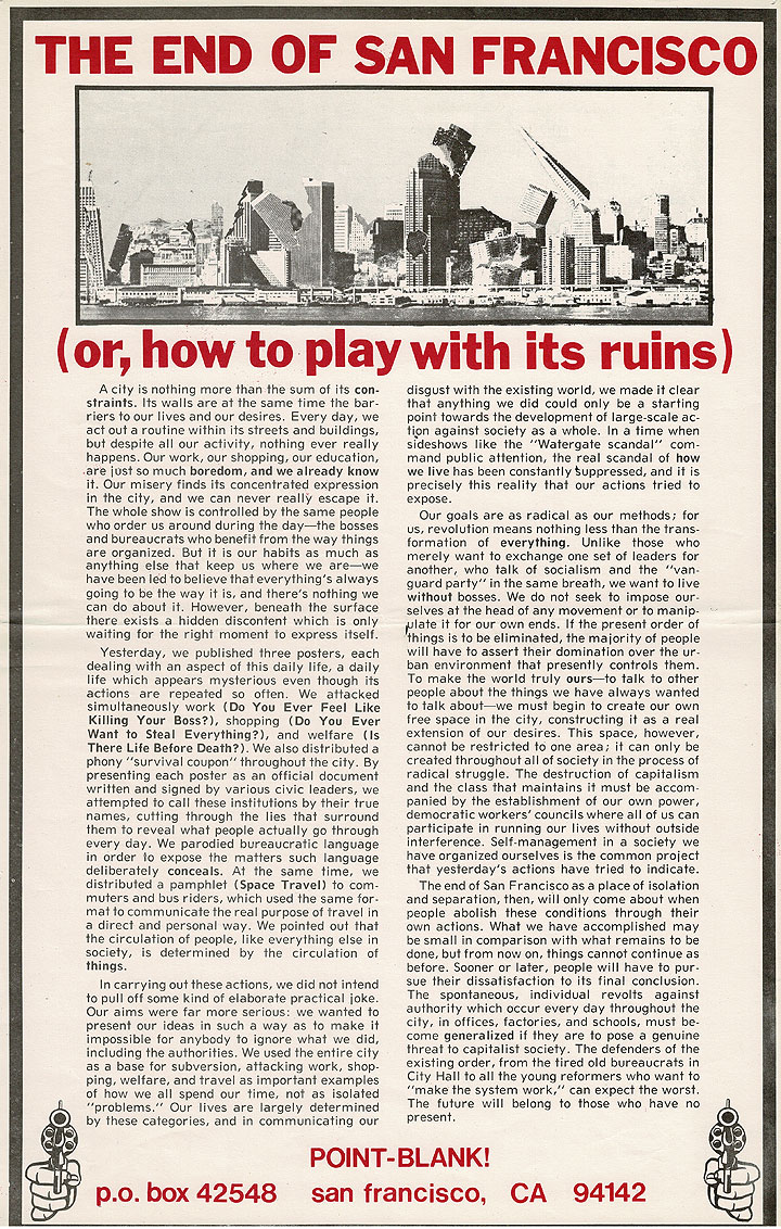 The end of San Francisco as a place of isolation and separation, then, will only come about when people abolish these conditions through their own actions. What we have accomplished may be small in comparison with what remains to be done, but from now on, things cannot continue as before. Sooner or later, people will have to pursue their dissatisfaction to its final conclusion. The spontaneous, individual revolts against authority which occur every day throughout the city, in offices, factories, and schools, must become generalized if they are to pose a genuine threat to capitalist society. The defenders of the existing order, from the tired old bureaucrats in City Hall to all the young reformers who want to "make the system work," can expect the worst. The future will belong to those who have no present.