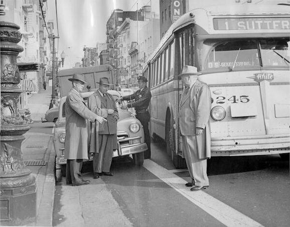 Even the bus stop zone was not a given by the late 1940s: “There is no uniformity regarding [the stopping of buses]. In some spots buses stop on the near side of cross streets, in others they move to the far side of the intersection. On some lines stops are made in an off-angle way at the curb line; in others patrons are forced to come to the center of the thoroughfare, as in the old-street car days, much to the annoyance of bus travelers and motorists as well,” wrote Leon J. Pinkson for the Chronicle in 1949 (8). People were still complaining decades later: one resident is quoted in a 1970 article as saying, “When I came to San Francisco, I was told the one place you could park for sure without getting a ticket was in a bus stop; that’s one thing that hasn’t changed” (9).