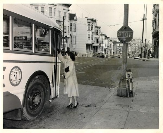 Woman boarding Muni bus at Haight and Divisadero, 1950. On the back of the photo: “PLEASE DON'T.. expect to board or alight except at regular stopping points.”