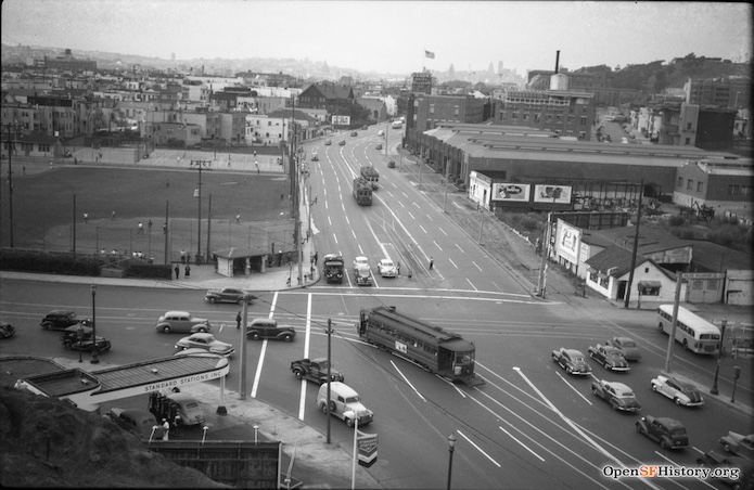 Bus shelter (center left) at Cesar Chavez and Potrero, 1946.