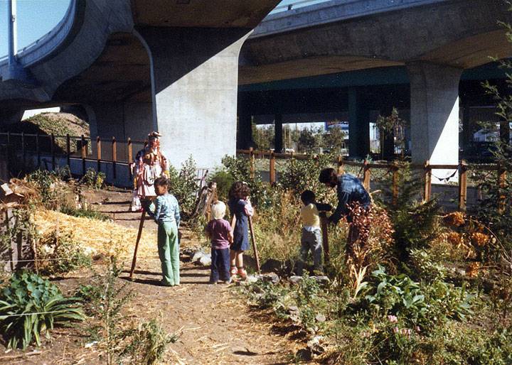 In 1974, Bonnie Ora Sherk and co-founder Jack Wickert helped create Crossroads Community (The Farm), affectionately known as The Farm. On an accumulated seven acres located partially underneath and adjacent to the then Army Street freeway interchange in San Francisco, they—with the help of the community and collaborators—turned two warehouses, concrete, and open space into a site-specific sculpture, farm, community center, school without walls, and human and animal theater. The San Francisco Mime Troupe, Make-a-Circus, and The Jones Family all took up residence there, as did artists, poets, dancers, punks, kids, gardeners, animals, and members of the community.