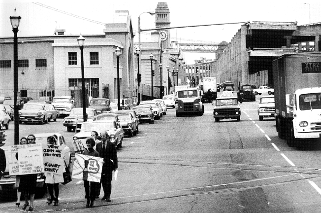 Freeway protestors walk along Embarcadero, old Embarcadero Freeway and Ferry Building in background, c. 1964