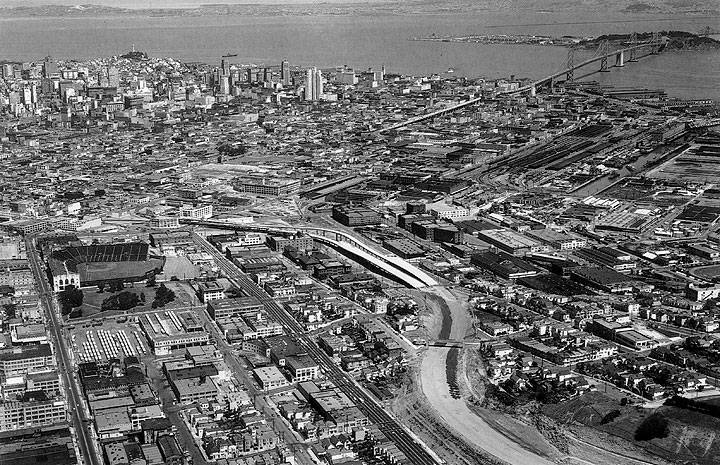 James Lick Freeway under construction in 1953: San Francisco's first. Seals Stadium, the old ballpark is visible in center-left of photo