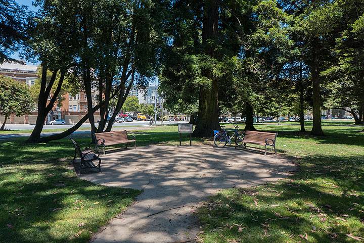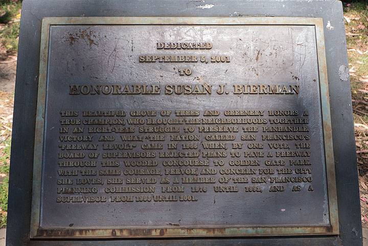 In this circular plaza at the western end of the Panhandle, near Shrader, sits a memorial to Sue Bierman for her role in the Freeway Revolt. She is also honored by having her name on the park where the Washington and Clay Street ramps to the Embarcadero Freeway once sat.