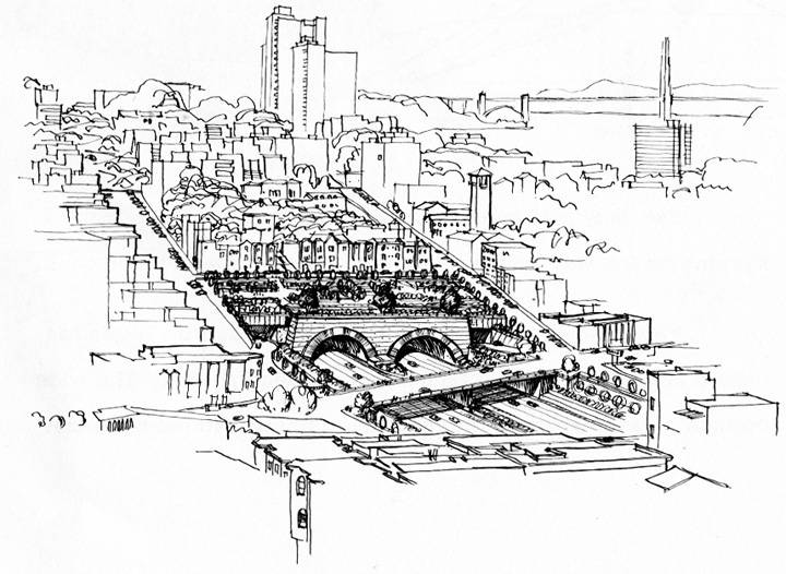 Early plan for 8-lane freeway to cut under Russian Hill on its way from the Embarcadero to the Golden Gate Bridge