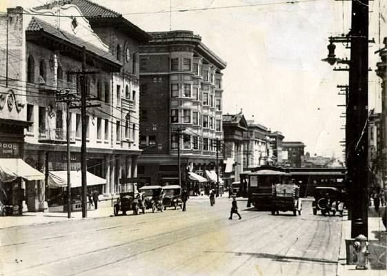 The same corner in 1918. Note the canvas-topped autos, women's long skirts and boys' knickers, popular in those days.