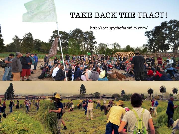 In 2012, inspired by the Occupy movement, a community group including former Berkeley students, taught under Miguel Altieri, created “Occupy the Farm”. On Earth Day, 2012, OTF led a high profile act of nonviolent civil disobedience by breaking the locks at the Gill Tract, planting a large plot of the land, and setting up an encampment to defend the crops. Their actions directly led Whole Foods, the corporate grocery store that planned to build on the farmland, to cancel its lease, one acre of the Gill Tract is now protected a community-driven and collaborative garden for 10 years (from 2012). A documentary, Occupy the Farm, was filmed and released internationally about their efforts.