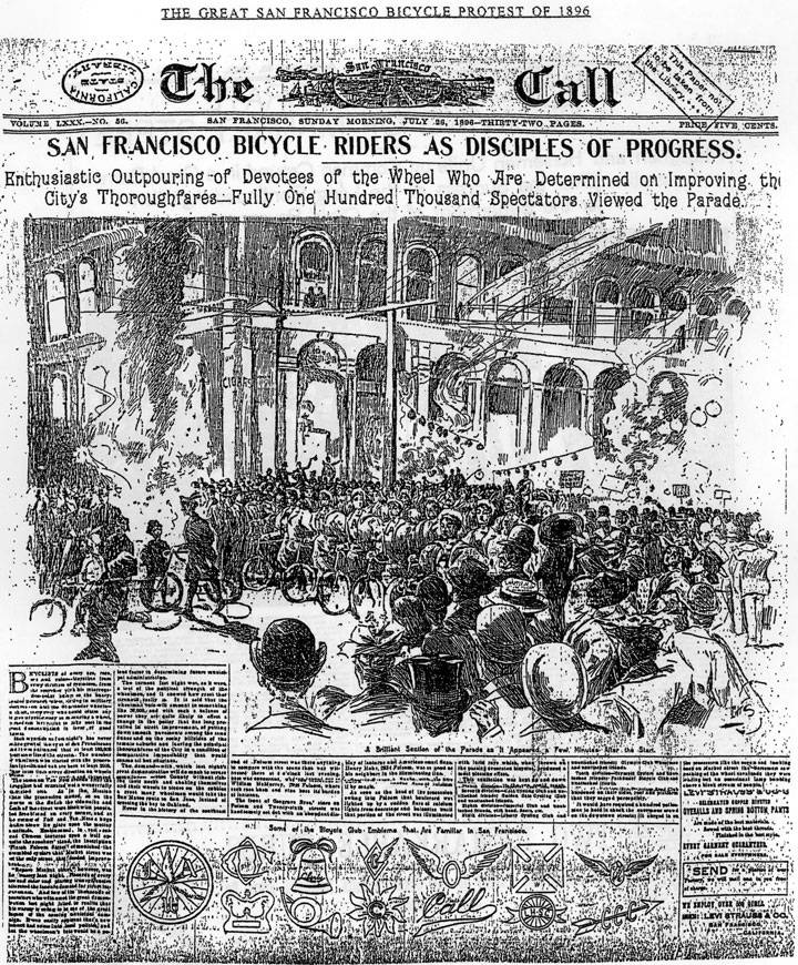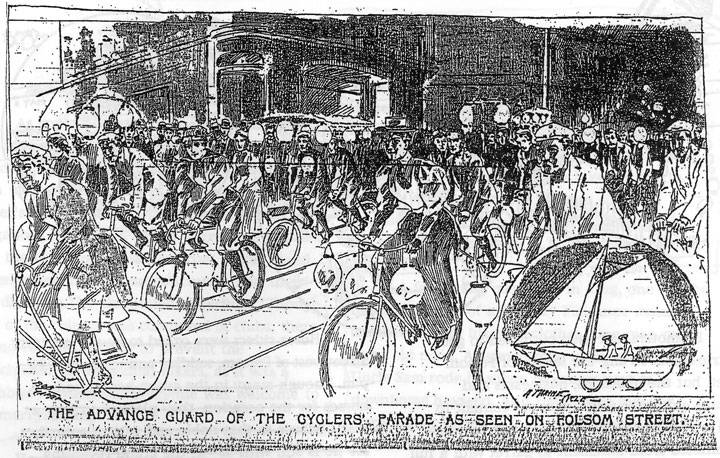 On Saturday night, July 25th of 1896, after months of organizing by cyclists and good roads advocates, residents cycled the streets in San Francisco, inspired by the possibilities of the bicycle.